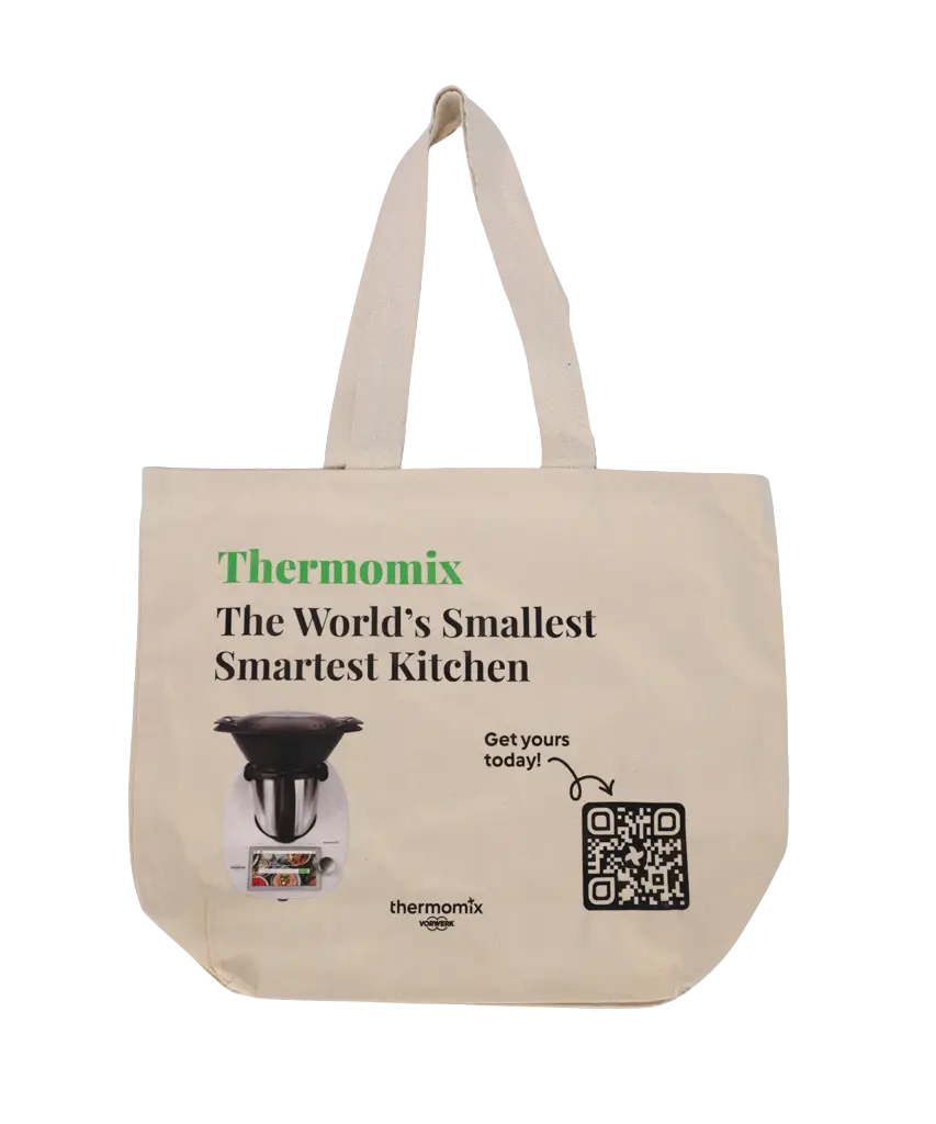Show your love for Thermomix with this stylish and durable tote bag. Crafted from high-quality cotton canvas, it features a sleek print of the Thermomix TM6 and an integrated QR code that takes you directly to the official Thermomix website – your source for product details, recipes, and inspiration. Perfect for carrying groceries, accessories, or your daily essentials in style.